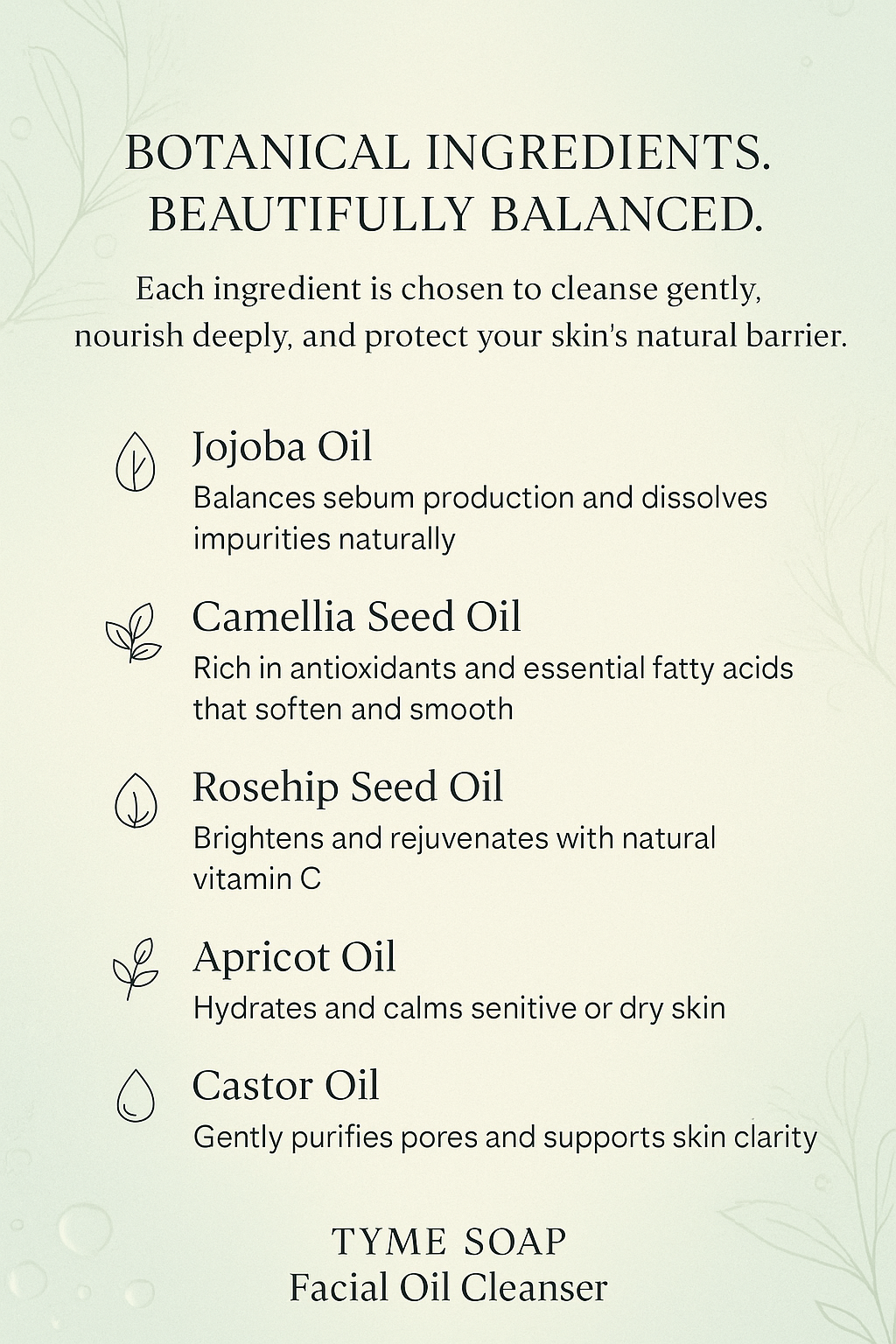 Where nourishment meets clarity — our Facial Oil Cleanser is the first step in Tyme’s signature two-step cleansing ritual. Formulated with a blend of botanical oils that mirror your skin’s natural composition, it effortlessly dissolves makeup, excess oil, and daily buildup without stripping or disrupting your moisture barrier. As the oil binds to impurities, it gently lifts them from the skin’s surface while infusing hydration and essential nutrients. The result is a clean that feels soft, supple, and balanced — never tight or dry. Perfect for all skin types, including sensitive and oily skin, this cleanser resets your complexion to a state of calm, hydrated harmony.